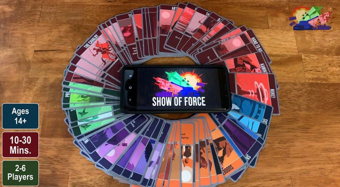 Show of Force is a 2-6 player competitive card game for players of all experience levels. It mixes the fun-for-everyone aspect of a party game with the strategic gameplay of a trading card game. You are at war! As commander, your goal is to destroy your enemies. There are 5 card types in your arsenal to help you achieve victory. Show of Force plays quickly by only letting players draw 1 card & play 1 card per turn. Show of Force can be played Free-for-All or as Teams, allowing for plenty of variety from a single deck of cards